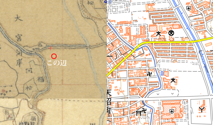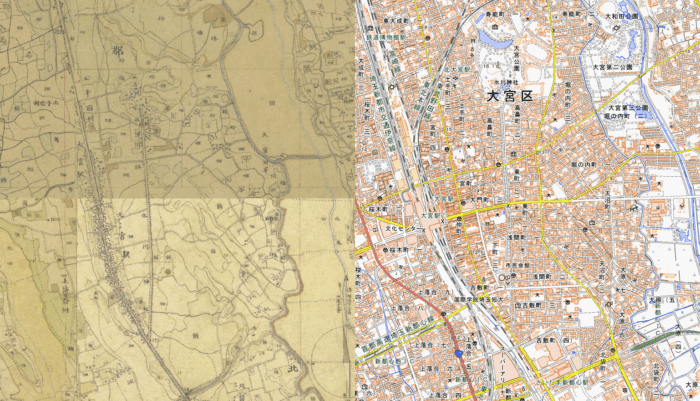 Mapサイトに移動 すると現在の地図と重ね合わせて見たり、住所を入力して検索することもできます。当時の実家や住まいを空から眺めてみたり、当時の登校ルートをなぞてみると周囲の景色を思い出すきっかけになったりと現在の街並みへの変遷を追ってみるのは案外と楽しいものです。 (おまけ) ジブンは現在埼玉県さいたま市大宮区に、野村くんは見沼区に居を構えております。我が家は1963年頃までは田んぼの中でありました…この辺は明治13年に陸軍が作成した「迅速測図」まで遡って現在と比較することが出来ます。それによると我が家は大宮区と見沼区(右側)を隔てる水田地帯(見沼田んぼ)の真ん中を横切る道の大宮側付根あたりに位置しております。
