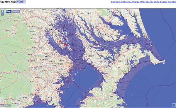 「大宮川岸」とある場所は、古来から河川を使った輸送の集積基地に相当する場所であったと考えられますが….この辺を太古まで遡ると….(海面シュミレーターFlood Mapで現在の関東平野の海面を13m上昇させて約2,400年前の弥生時代の旧海岸線をシュミレート)見沼田んぼは古代の海岸線付近〜海の下にあったと推察されます。